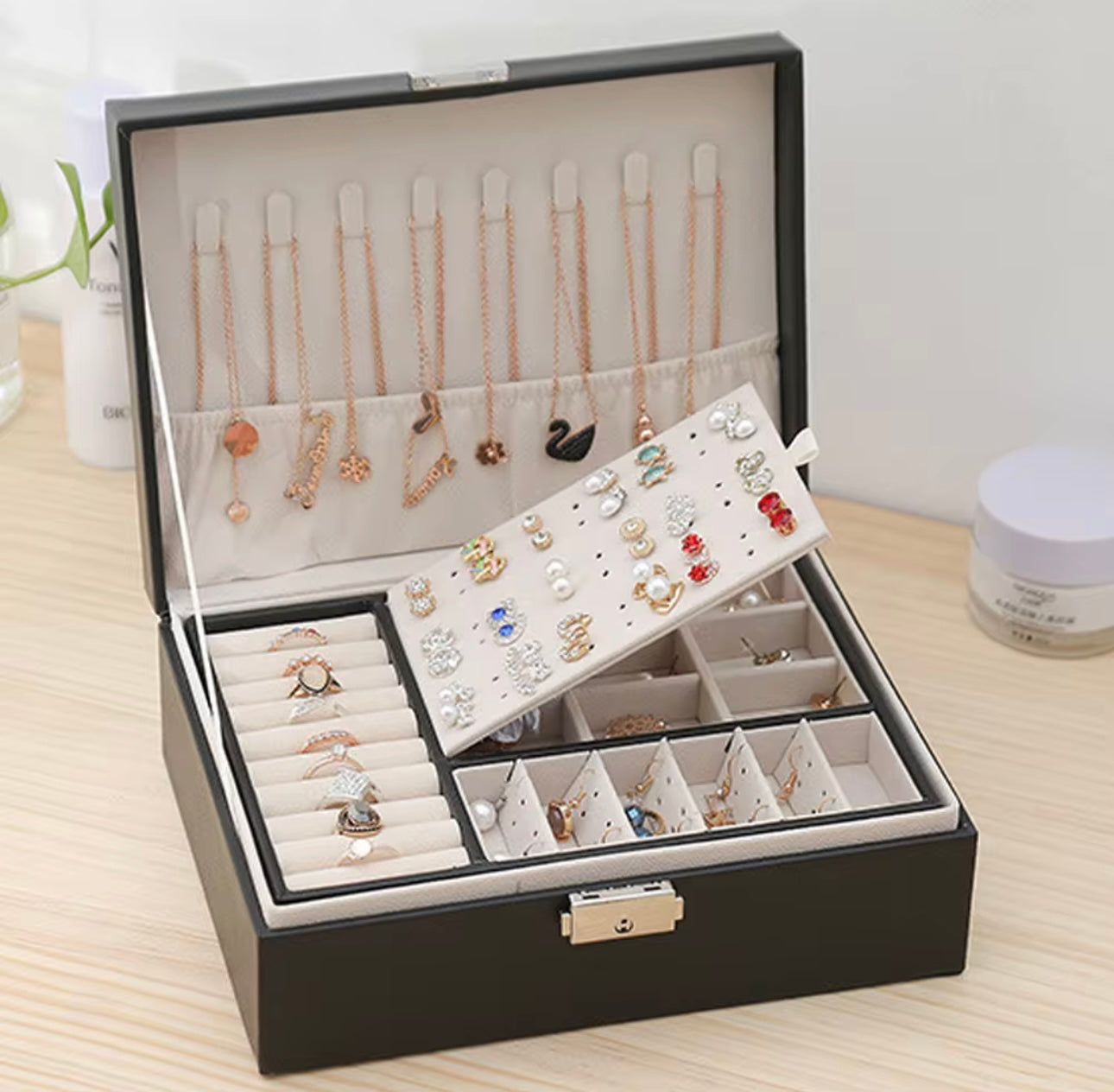 Timelessly designed with vintage charm, this elegant leather jewelry box features a secure key lock and double-layer compartments to neatly store and protect your earrings, bracelets, rings, and necklaces. Crafted for both beauty and function, its classic exterior and soft-lined interior make it a sophisticated storage solution for your precious accessories.