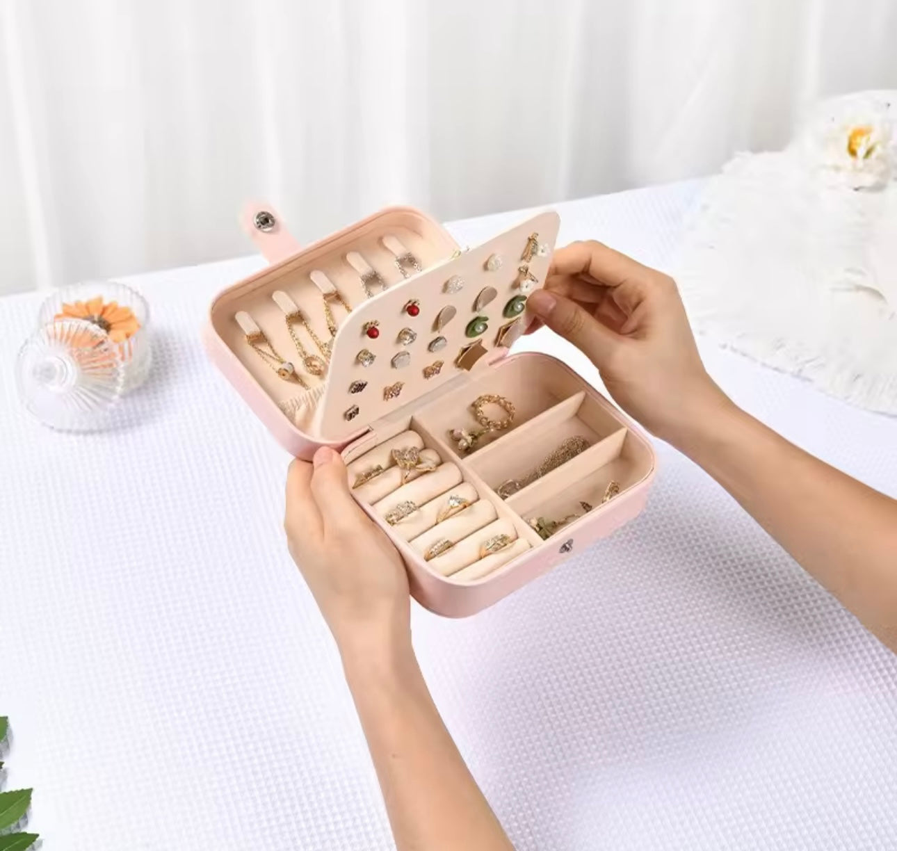 Keep your favorite jewelry safe and tangle-free on the go with this elegant Mini Jewelry Organizer Case. Designed for travel and everyday use, this compact pouch features dedicated compartments for earrings, rings, and necklaces, ensuring everything stays organized and easy to find. Lightweight yet durable, it fits perfectly in your handbag, suitcase, or carry-on, making it ideal for vacations, business trips, or daily commutes. The soft interior lining protects your valuables from scratches, while the secure zipper closure keeps them safely tucked away.